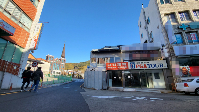 삼도수군통제영 남문이자 통영성 정문 역할을 한 청남루 복원 부지를 차지한 옛 금강제화 건물. 이 부지와 건물 수용이 안돼 실물 복원이 중단된 상태다. 그런데 최근 이 건물이 일제강점기 통영지역 독립운동자 2명을 사지로 내몬 일본인 밀정이 운영한 상가였다는 주장이 제기돼 논쟁이 가열되고 있다. 김민진 기자