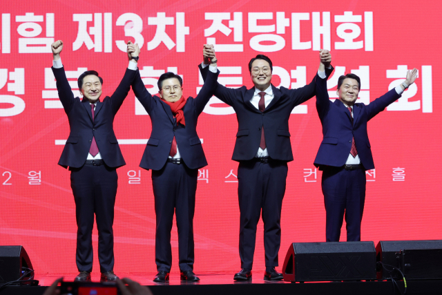 국민의힘 김기현(왼쪽부터)·황교안·천하람·안철수 당 대표 후보가 28일 오후 대구 북구 엑스코에서 열린 제3차 전당대회 대구·경북 합동연설회에서 손을 맞잡고 인사하고 있다. 연합뉴스