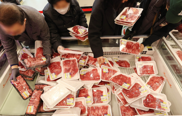 28일 오전 서울 서초구 농협 하나로마트 양재점에서 열린 '2023 소프라이즈 한우 50% 할인' 행사에서 시민들이 상품을 고르고 있다. 연합뉴스