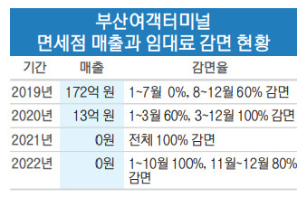 해양수산부는 3년간 영업하지 못한 부산면세점의 어려움을 이해한다면서도 다른 터미널과의 형평성 문제로 사용료를 부과할 수밖에 없다고 해명했다. 많든 적든 터미널에서 매출이 발생하니 100% 감면은 불가하다는 뜻이다.