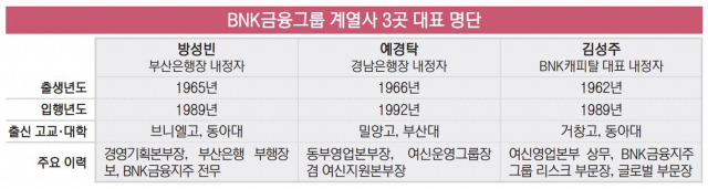 BNK금융그룹 주요 계열사 3곳 중 2곳의 수장이 지주에서 추천한 후보로 채워지면서 ‘빈대인호’ 출범을 앞두고 진행된 이번 최고경영자(CEO) 승계 특징은 개혁과 변화로 설명된다.