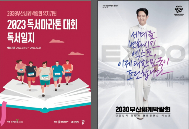 2030세계박람회 유치 기원 독서 마라톤 대회 포스터(왼쪽)와 부산엑스포 홍보 포스터. 부산시 제공