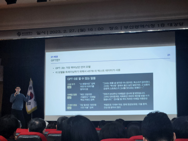 인공지능 교육 플랫폼 기업 (주)엘리스그룹 김재원 대표는 지난달 27일 오후 부산 연제구 연산동 부산시청 1층 대강당에서 이렇게 말했다. 그는 이날 ‘사례로 배우는 챗GPT 활용법’을 주제로 강연했다. 챗GPT에 대한 관심도를 반영하듯 500여 명의 시민이 대강당을 가득 메웠다.