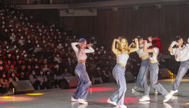 28일 부산 수영구 KBS부산방송총국 부산홀에서 2023년 동서대학교 신입생 한마당에서 댄스 동아리가 축하공연을 하고 있다.