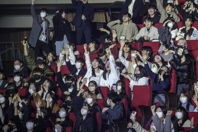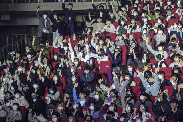 28일 부산 수영구 KBS부산방송총국 부산홀에서 2023년 동서대학교 신입생 한마당에서 학생들이 교내 동아리, 가수 박혜원과 비오의 축하무대를 즐기며 호응을 하고 있다. 신입생 행사가 대면으로 열린 것은 신종 코로나바이러스 감염증(코로나19) 사태 이후 4년 만이다.