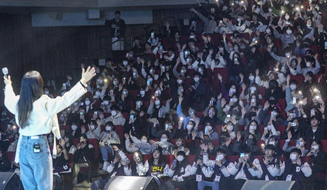 28일 부산 수영구 KBS부산방송총국 부산홀에서 2023년 동서대학교 신입생 한마당에서 가수 박혜원의 축하무대에 신입생들이 호응을 하고 있다.