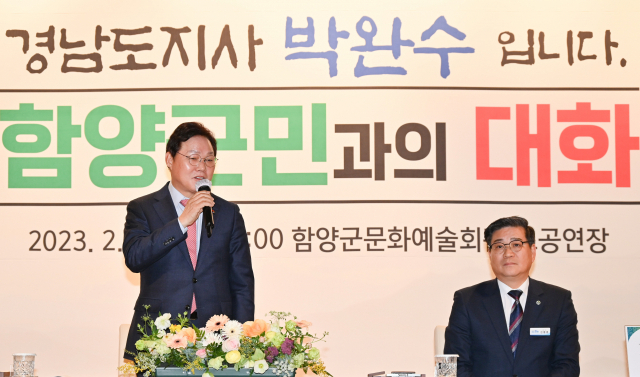 박완수 경남도지사가 지난달 23일 함양군문화예술회관 대강당에서 ‘함양군민과의 대화’를 갖고 있다. 경남도 제공