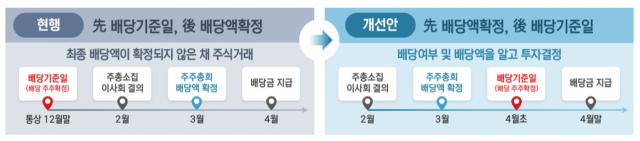 지금까지는 통상 12월 말 배당기준일이 설정된 이후 이듬해 3월 주주총회를 통해 배당금을 확정했다. 그러나 배당 절차가 개선되면 3월 주총에서 배당액을 확정한 이후로 배당기준일을 정하게 된다.