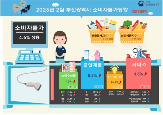 6일 통계청과 동남지방통계청이 발표한 '2023년 2월 소비자물가동향'(사진)에 따르면 지난달 부산의 소비자물가지수는 110.01(2020년=100)로 전월 대비 0.2%, 전년 동월 대비 4.6% 각각 상승했다. 전월(5.0%)보다는 상승률이 0.4%포인트 떨어졌다.