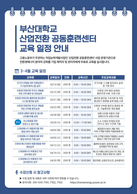 부산대학교 산업전환 공동훈련센터는 3~4월 재직자 무료 직무교육과정에 참여할 교육생을 모집하고 있다고 7일 밝혔다.