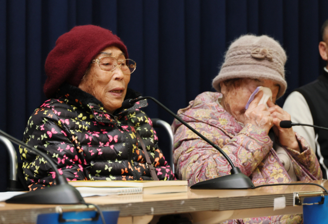 일제 강제동원 피해 할머니들이 7일 오후 국회에서 기자회견을 열어 정부의 강제동원 해법을 규탄하고 일본의 사죄와 배상을 촉구하고 있다. 연합뉴스