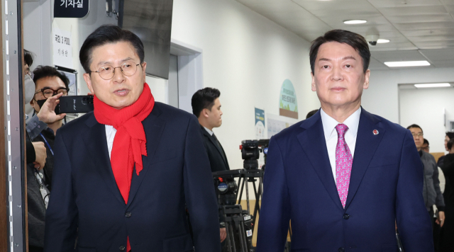 국민의힘 안철수 당 대표 후보(오른쪽)와 황교안 당 대표 후보가 7일 오후 서울 여의도 국회 소통관에서 '대통령실 행정관 단톡방 김기현 지지' 논란 관련 공동회견을 하기 위해 기자회견장에 들어서고 있다. 연합뉴스