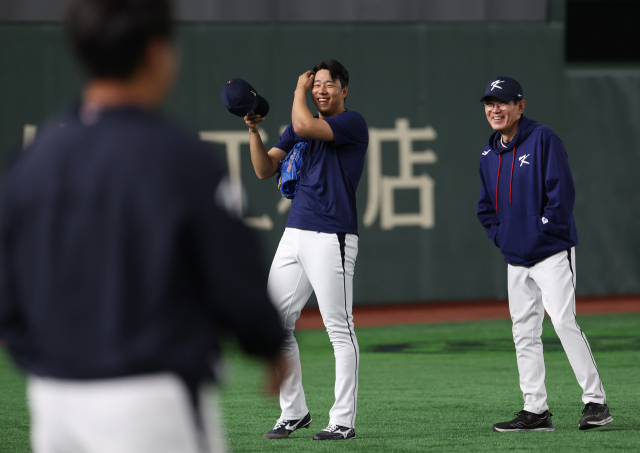 2023 월드베이스볼클래식(WBC)이 개막한 8일 오전 일본 도쿄돔에서 열린 한국대표팀 훈련에서 이강철 감독과 투수 정우영이 환하게 웃고 있다. 한국대표팀은 9일 도쿄돔에서 B조 본선 1라운드 호주와 첫 경기를 펼친다. 연합뉴스