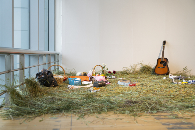김정명이 1975년 전시장에 설치했던 ‘풀밭 위의 식사 이후’는 마네의 ‘풀밭 위의 식사’에서 아이디어를 얻어 제작한 설치작품이다. 젊은 세대의 대표적 놀이 문화였던 소풍을 풍자한 작품이다. 풀밭 위에 기타, 도시락, 먹다 남은 음식물, 속치마 등을 놓아뒀다. 소풍을 마치고 사람들이 떠난 자리를 설치작품으로 표현한 것이다.