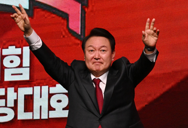 윤석열 대통령이 8일 오후 경기도 고양시 일산 킨텍스에서 열린 국민의힘 제3차 전당대회에서 축사를 위해 이동하며 인사하고 있다. 연합뉴스