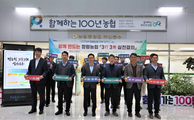 부산농협(본부장 정병규)은 8일 부산검사국, 농협경제지주 부산본부 등 임직원 25명이 참석한 가운데 윤리경영에 앞장설 것을 결의하는 ‘3행 3무 실천 결의대회’를 개최했다.