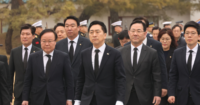 국민의힘 김기현 신임 당대표와 지도부가 9일 국립서울현충원을 찾아 현충탑에 참배하기 위해 이동하고 있다. 연합뉴스