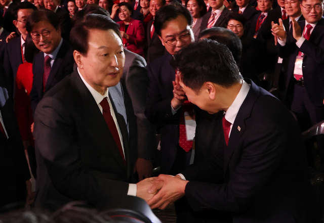 윤석열 대통령이 8일 경기도 고양시 킨텍스에서 열린 국민의힘 제3차 전당대회에서 김기현 당대표 후보와 인사하고 있다. 연합뉴스