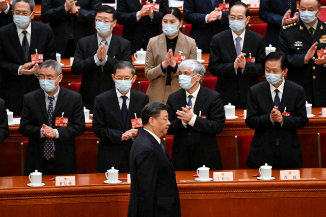 시진핑 중국 국가주석이 지난 10일 국가주석 ‘3연임’을 확정해 본격적인 집권 3기를 시작했다. 시 주석이 12일 전국인민대표대회 제5차 전체회의에 박수를 받으면서 입장하고 있다. AFP연합뉴스
