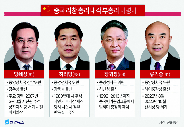 리 총리에 이어 국무원 부총리들 또한 시 주석의 측근으로 꼽히는 딩쉐샹(61)과 허리펑(68), 장궈칭(59), 류궈중(61)이 지명됐다. 이에 따라 시 주석의 복심인 리 총리가 이끄는 새 내각에서는 이전 리커창 국무원 시절에 비해 시 주석 입김이 한층 강해졌다. 수석인 상무 부총리를 맡을 딩쉐샹은 지난해 최고 지도부인 중앙정치국 상무위원회 입성 직전까지 중앙판공청 주임 겸 국가주석 판공실 주임을 맡아 중앙에서 시 주석의 ‘비서실장’ 역할을 했다. 류허 전 부총리의 뒤를 이어 경제 담당 부총리를 맡을 것으로 보이는 허리펑은 광둥성 출신으로, 1980년대 시 주석이 샤먼시 부시장으로 재직할 당시 샤먼시 정부 판공실 부주임으로 일했다.
