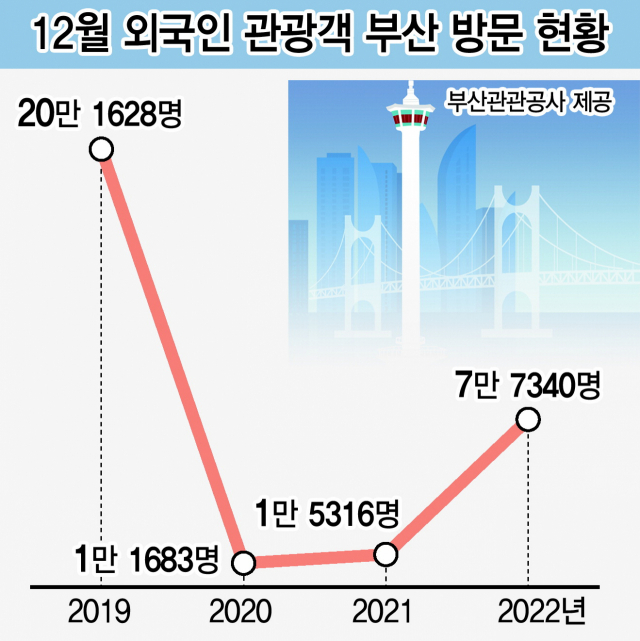 부산관광공사의 ‘외국인 관광객 부산 방문 동향 보고’에 따르면 지난해 12월 한 달간 부산을 방문한 외국인 관광객은 7만 7340명으로 전년 동기 대비 5배가량 증가했다. 작년 12월 부산을 찾은 외국인 관광객 중에서는 일본인이 1만 1351명으로 전체의 14.7%를 차지하며 가장 많았다.