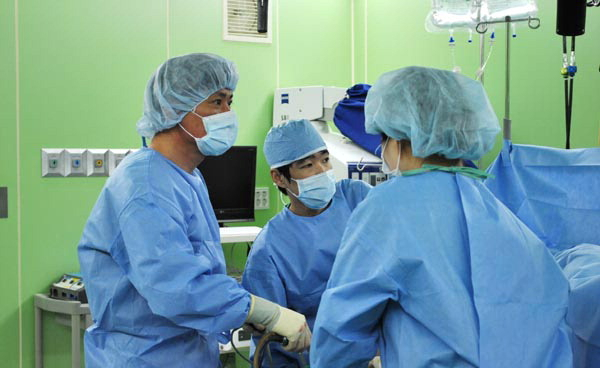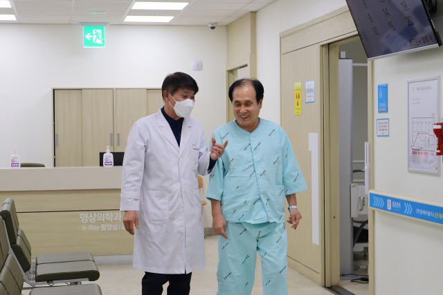 총상으로 인한 골관절염으로 무릎 인공관절 수술을 받은 석해균 선장이 집도의 김인환 원장과 재활치료실을 나서고 있다. 아래는 김인환 원장의 수술 장면. 부산고려병원 제공