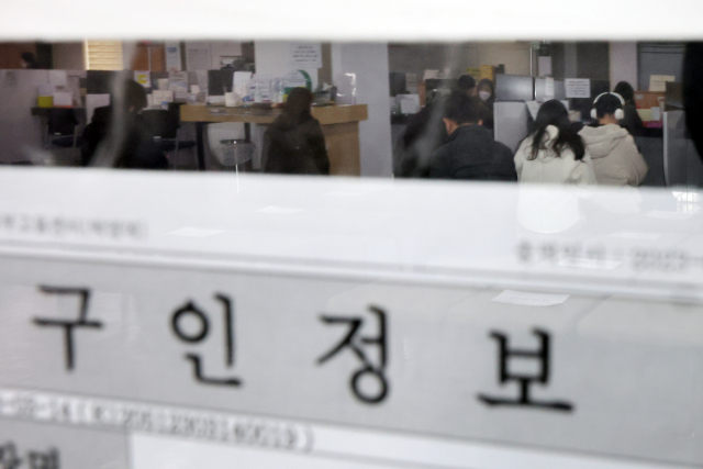 15일 서울 마포구 서부고용복지플러스센터의 일자리 정보 게시판에 실업급여 신청을 하는 시민들의 모습이 비치고 있다. 이날 통계청이 발표한 '2월 고용동향'에 따르면 지난 2월 취업자 수는 1년 전보다 31만2천명 늘어나는 데 그치며 2년 만에 최소 증가 폭을 기록했다. 연합뉴스