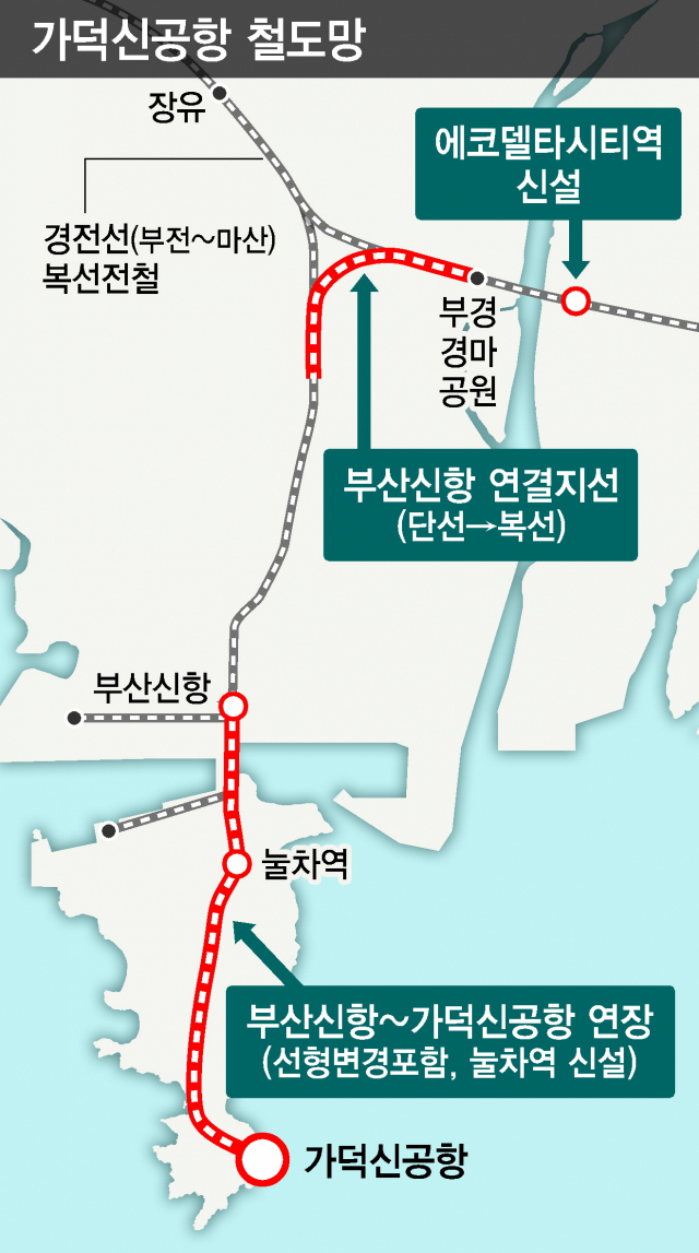 건의 내용을 보면 우선 일반철도의 경우, 부산신항 연결지선을 단선에서 복선으로 확장하는 내용이 포함됐다. 주변 철도망인 부전~마산 복선전철과 부산신항선 모두 왕복 운행이 가능한 복선전철인데다 신공항 개항과 주변 공항복합도시 조성 때 철도 이용 수요가 크게 늘어날 것에 대비해 단선이 아닌 복선으로 확대할 필요가 있다는 주장이다.