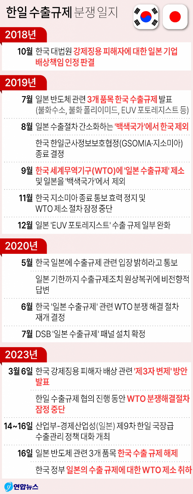 일본은 한국 대법원이 2018년 10월 강제징용 피해자에게 일본 피고 기업이 배상하라는 확정판결을 내리자 반발하면서 2019년 7월 불화수소 등 3개 품목을 대상으로 한국 수출규제에 나섰다. 일본은 같은 해 8월에는 화이트리스트(수출 절차 간소화 혜택을 주는 백색국가 리스트)에서도 한국을 배제했다. 한국은 이에 맞서 그해 9월 일본의 수출규제 조치를 WTO에 제소했다.