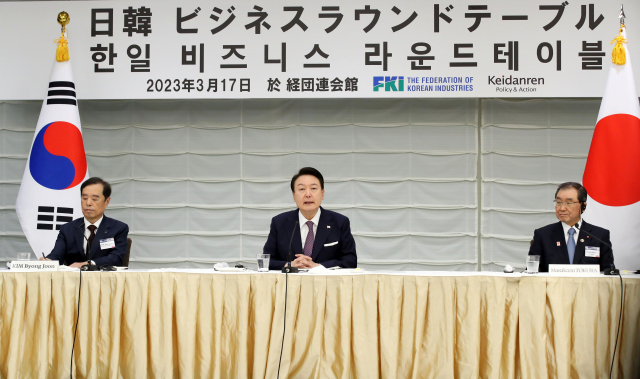1박2일간의 일정으로 일본을 방문한 윤석열 대통령이 지난 17일 도쿄 게이단렌(일본경제단체연합회) 회관에서 열린 한일 비즈니스라운드 테이블에서 인사말을 하고 있다. 연합뉴스