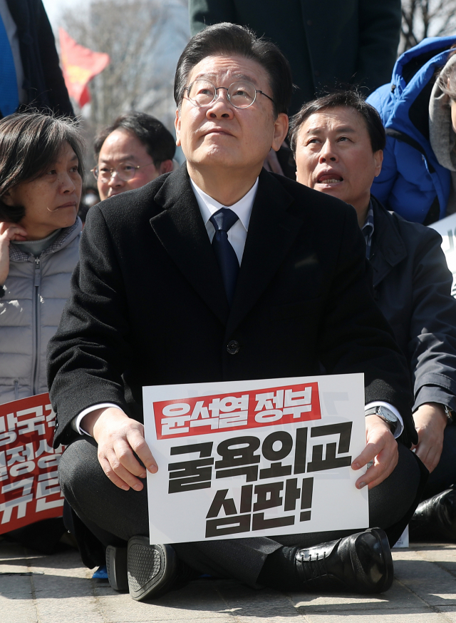 더불어민주당 이재명 대표가 18일 서울시청 광장 앞에서 열린 '한일정상회담 규탄' 범국민대회에 참석해 한일 정상회담을 마치고 전날 돌아온 윤석열 대통령을 향해 "일본에 간 대통령이 국민 뜻대로 행동하지 않고 끝내 일본 하수인의 길을 선택했다"며 맹비난했다.