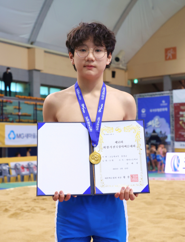 제53회 회장기 전국장사씨름대회 초등부 개인전 용장급에서 우승한 내리초등학교 김태경. 부산시씨름협회 제공