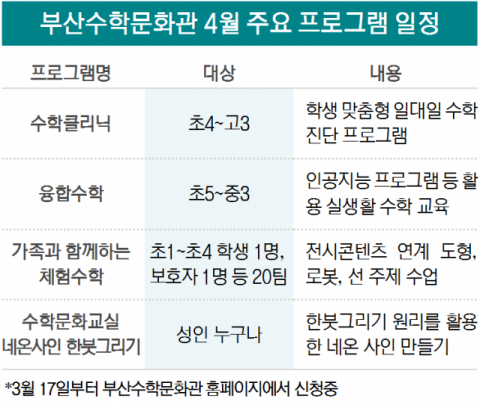 한편 부산수학문화관 프로그램 신청은 부산수학문화관 홈페이지(https://bmcm.pen.go.kr)에서 보호자, 학생 등이 누구나 신청할 수 있다.