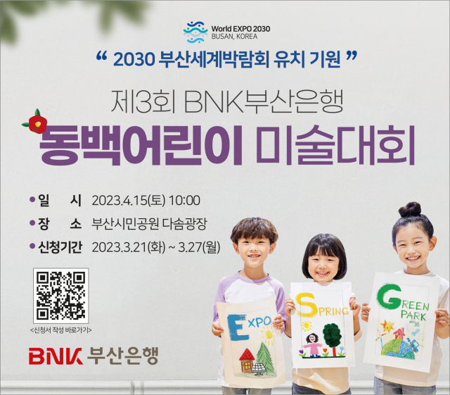 BNK부산은행은 오는 4월 15일 부산 부산진구 부산시민공원 다솜광장에서 ‘2030부산세계박람회’(부산월드엑스포) 유치를 기원하는 제3회 동백어린이 미술대회를 개최한다고 밝혔다.