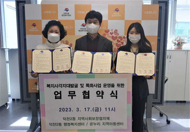 부산 북구 덕천2동 행정복지센터(동장 주정원)는 최근 동 지역사회보장협의체(위원장 최연자)·온누리지역아동센터(센터장 안순영)와 함께 복지사각지대 제로를 위한 업무협약을 체결했다.