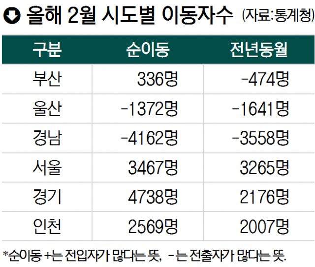 22일 통계청에 발표한 ‘국내 인구이동 통계’에 따르면 부산에서는 2월에 4만 851명이 타 시도에서 부산으로 들어오고 4만 515명이 빠져나가 결과적으로 336명이 순유입됐다.