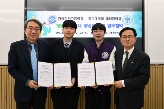동의대 게임공학과(학과장 김치용·오른쪽)와 경성전자고등학교(교장 하민용·왼쪽)는 지난 22일 경성전자고등학교 자동제어기기제작실에서 게임분야 기술인재 양성을 위한 업무협약을 체결했다.