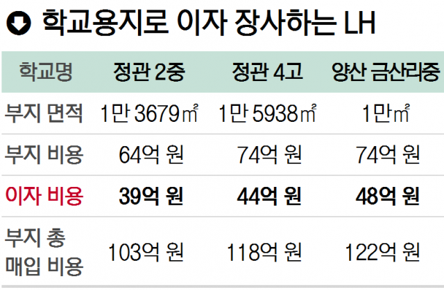LH 측은 이 규정에 따라 최근 부산 기장군 정관신도시 택지 내 학교 용지(정관4고)를 매입하려는 A여고에 45억 원가량의 용지 매입 이자를 요구했다. LH 측의 계산법에 따르면, 과밀이 심각한 정관 신도시, 양산 석금산 신도시 학교 3곳을 신축하기 위해 용지 이자로만 수백억 원이 들어갈 것으로 예상된다.