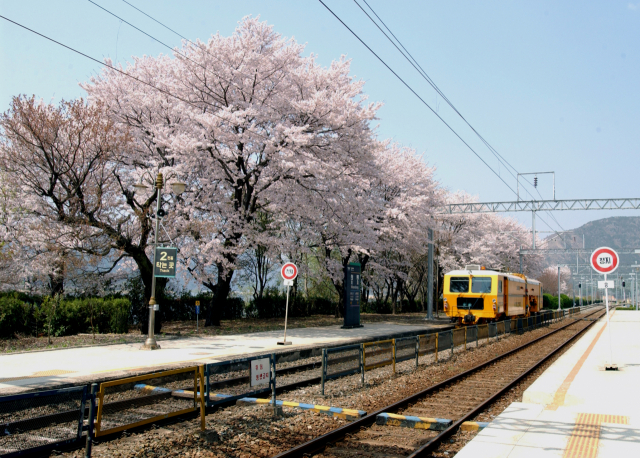전국에서 벚꽃이 꽃망울을 터트린 가운데 경남 양산 원동역에 식재된 벚꽃 역시 꽃망울 터뜨려 지나가는 열차가 함께 아름다움을 더하고 있다. 양산시 제공