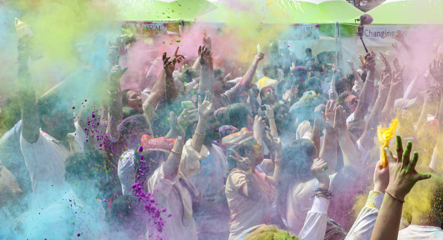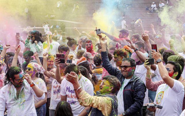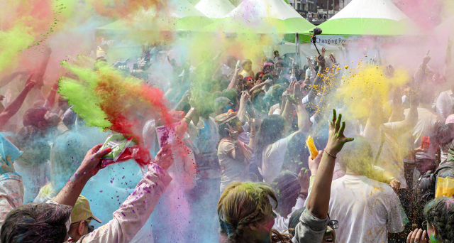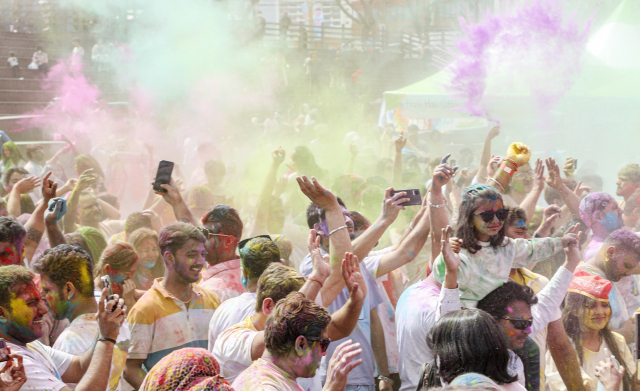 26일 경남 밀양시 영남루 맞은편 밀양강 둔치에서 열린 ‘2023 밀양 홀리해이 색채 축제’에 참석자들이 색색 가루를 뿌리며 즐거워하고 있다. 코로나19로 4년 만에 열리는 홀리해이 색채 축제는 매년 힌두력 3월에 열리는 인도의 대표적 봄맞이 축제로 국적, 나이, 성별, 지위에 상관없이 사랑과 평화를 염원하는 축제이다.