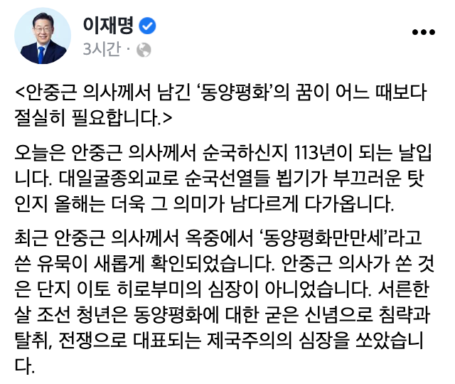 이 대표는 이날 페이스북에 "안중근 의사께서 남긴 ‘동양평화’의 꿈이 어느 때보다 절실히 필요하다"는 글과 함께 이같이 적은 뒤 "그것이 죽음도 무릅쓰고 동양 평화를 위해 헌신한 안중근 의사의 숭고한 얼을 기리는 길이라 믿는다"고 말했다. 그러면서 "대일 굴종 외교로 순국선열들을 뵙기가 부끄러운 탓인지 올해는 (안중근 의사 순국의) 의미가 남다르게 다가온다"고 덧붙였다. 이어 그는 "최근 안중근 의사께서 옥중에서 ‘동양평화만만세’라고 쓴 유묵이 새롭게 확인되었다"면서 "안중근 의사가 쏜 것은 단지 이토 히로부미의 심장이 아니었다. 서른한 살 조선 청년은 동양평화에 대한 굳은 신념으로 침략과 탈취, 전쟁으로 대표되는 제국주의의 심장을 쏘았다"고 언급했다.