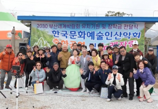 한국문화예술인산악회(회장 오춘식)는 지난 25일 경남 거창 우두산 산행을 하며 가조면상인회(회장 노영호) 주관 2030부산세계박람회 유치 기원 축하공연과 연산초등학교 6학년 황서연 학생에게 장학금을 전달했다.