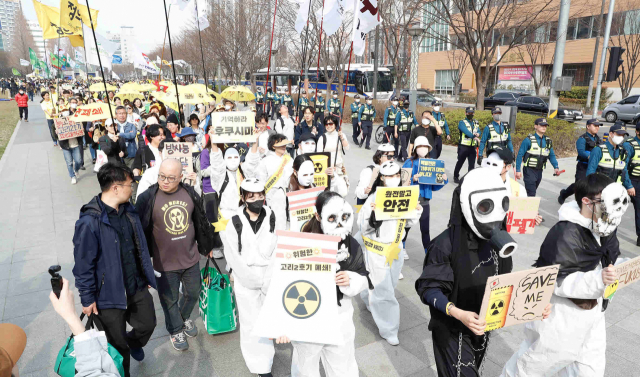고리2호기 수명 연장과 영구 핵폐기장 건립을 반대하는 시민대회가 지난 11일 부산 송상현광장에서 열려 참여 시민들이 가두행진을 펼치고 있다. 정대현 기자 jhyun@