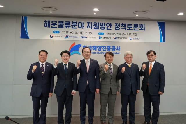 지난달 16일 한국해양진흥공사 대회의실에서 열린 ‘해운물류분야 지원방안 정책토론회’에서 주요 참석자들이 기념촬영을 하고 있다(왼쪽 두 번째 김양수 해양진흥공사 사장, 세 번째 조승환 해양수산부 장관). 한국해양진흥공사 제공