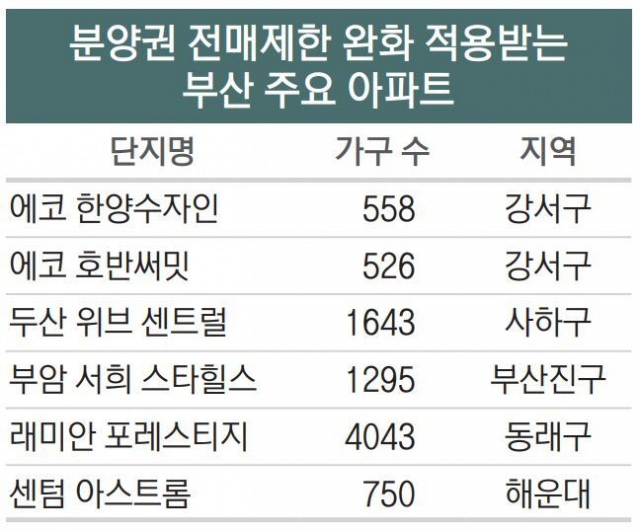 부산에선 동래구 온천동 래미안 포레스티지, 북구 한화포레나 덕천2차, 부산진구 부암 서희스타힐스 등 대단지나 에코델타시티 등 공공택지를 중심으로 전매 시장이 활성화될 것으로 전망된다. 전매제한 기준일은 입주자 선정일(당첨자 발표일)이다. 11월 분양해 1년이 지난 에코델타시티 한양수자인, 호반써밋 스마트시티는 주택법시행령이 개정되면 곧바로 분양권 전매가 가능해진다. 강서자이 에코델타는 오는 6월 16일, 이편한세상 에코델타 센터포인트는 7월 12일, 에코델타시티 푸르지오 센터파크는 11월 7일부터 전매를 할 수 있게 된다.