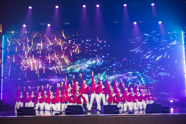 이달 5일 ‘2030 부산 세계박람회 실사단 환영 시민 대축제’를 여는 월드엔젤피스예술단 공연 장면. 월드엔젤피스예술단 제공