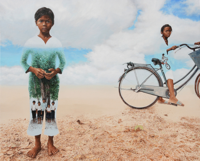‘Banteay Srey/The sky and The earth’(2008)는 넓게 펼쳐진 청명한 하늘을 배경으로 메마른 땅을 딛고 서 있는 두 명의 여자아이를 표현했다. 다른 작품에서의 밝은 모습과는 달리 아이들은 다소 굳은 표정으로 정면을 응시하고 있다. 정면으로 서 있는 아이와 자전거를 잠시 멈춘 아이는 이방인과의 만남에 경계하는 모습을 보인다. 메마른 땅과 땅을 딛고 있는 맨발은 척박한 현실을 반영하고, 왼쪽의 손가락 끝을 만지는 모습은 긴장한 아이의 심정을 나타낸다.