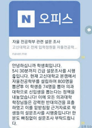 고신대 의과대 학생회 측에서 올린 SNS 메신저 내용 일부. 인터넷 사이트 캡처