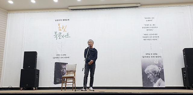 가수 최백호가 지난달 31일 부산일보 대강당에서 열린 첫 산문집 ‘잃어버린 것에 대하여’ 발간 기념 북 콘서트를 진행하고 있다. 이우영 기자