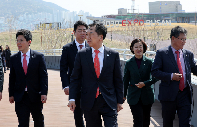국민의힘 김기현 대표를 비롯한 당 지도부가 지난달 31일 2030부산세계박람회 무대가 될 부산 동구 북항 친수공원을 둘러보고 있다. 연합뉴스
